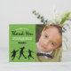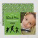 Soccer themed birthday thank you cards featuring a green football pitch background, a photo of the child, soccer players, footballs, and a modern thank you template that is easy to personalize.
