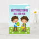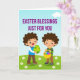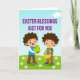 This card shows a spring scene with two cartoon-style children standing close together on a rolling green hill dotted with tiny white flowers 🌷. Their dark hair and big, expressive eyes are drawn with rounded features, and their wide smiles lean toward friendship, like they’re sharing a private joke while looking out at the viewer. The child on the left holds up a large emerald-green oval decorated with small yellow flowers and faint stripe accents. Beside them, the other child cradles a golden-yellow woven basket filled with smaller decorated ovals in red, blue, pink, and green, arranged so the colors feel shared between them. Across the upper area, a large line of text sits centered in deep purple, standing out against the sky without covering the characters. The background sky fades from light blue at the top to a paler tone near the horizon, giving the scene a soft, airy look 🐇. A single puffy cloud floats near the upper right, above the purple lettering.