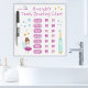 Customizable kid's weekly erasable teeth brushing chart visual schedule in pink colors and personalized with the girl's name. It includes 2 morning and evening teeth per day that can be marked or circled.
