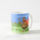 Cheerful cup with my original image of a baby turkey waving, with maple leaves blowing around him. Customizable text says "Happy Thanksgiving!"
