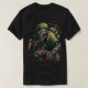 The image depicts a menacing cyborg dressed in torn and blood-stained urban clothing. The cyborg has sharp metallic claws on its hands, stained with blood, suggesting it is a combat machine or assassin. It wears a green cap and a backpack with tubes and technological devices connected to its body. The figure is in an aggressive pose, with bent knees and claws ready to strike. The combination of human and mechanical elements, along with the backdrop of destruction, creates an atmosphere of tension and danger.