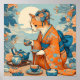Kimono Kitty Having Tea Japanese Orange Blue Poster