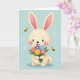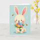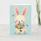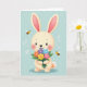 Designed with a friendly long-eared bunny in soft cream and light blush tones, this illustration draws you in with wide, shiny eyes and a small, tender smile 🐰. The bunny hugs a full bouquet close to its chest, as if offering it to someone just out of frame, adding a gentle note of romance and friendship. The flowers mix orange, pink, yellow, blue, and purple blossoms, tucked among deep green leaves that fan outward. Behind the bunny, a pastel blue-green backdrop with faint dappled patches suggests fresh air and an easy spring afternoon 🌷. Two small striped flying insects hover on either side, their wings catching light with a subtle sheen as they drift near the bouquet. Near the top area, thin white heart outlines float upward, leaving open space where a short greeting could sit in a small, light-colored font. A fluffy, lighter-toned tail peeks out near the lower edge, softly rounded against the cool background.