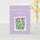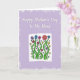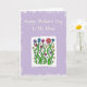 This greeting card features a soft lavender background with a gentle, cloud-like blur around the edges, setting a calm, caring tone ❤️. Near the top, a short Mother’s Day message appears in white lettering, centered and spaced to feel light against the purple. Below the text, a bright white rectangle frames a simple garden scene, like a little window into a sunny day. Inside, looping green stems with dark outlines rise upward, leaning toward one another the way close family might, creating a tender sense of connection. The flowers vary in size and height, with petals in fuchsia, sky blue, sunny yellow, and rich purple, giving the arrangement an affectionate, lively rhythm 🌼. The contrast between the pastel background and the colorful blooms makes the center illustration stand out without feeling harsh. The stems curl and overlap gently, and the blossoms are scattered across the white panel in an upward-reaching pattern with rounded petals and small circular centers.