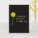 This card features a single bright flower on a wide black background, creating a quiet stage for a caring message ❤️. On the left, the bloom has sunny yellow petals fanning out from a warm brown center, like a small spotlight meant for someone special. A slim green stem drops downward, adding a gentle, grounded touch that feels calm and steady. To the right, the words “THINKING OF YOU!” appear near the upper area in uppercase yellow lettering, standing out with confident warmth. Just below, “On Mother’s Day” is written in smooth white lettering, softer in tone and placed as a tender follow-up line. The strong contrast between black, yellow, green, and white gives the design a close, intimate feel, like a note left for someone you care about 🌼. The flower sits left of center with the yellow headline to its right and the white occasion line directly beneath it.