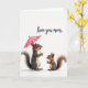On the front of the card, a white background keeps the focus on two woodland animals standing close together, their soft fur shaded in warm brown, gentle gray, and creamy white. The larger one stands slightly behind and to the side, holding a small bright pink umbrella above them both, as if making a little safe space ❤️. It looks down with a tender, protective gaze, while the smaller one meets its eyes with wide dark pupils and paws held slightly open, like it’s leaning into the affection. Their fluffy tails curl outward, adding a cozy frame to the pair and hinting at a family bond or close friendship. Soft, diffused lighting gives the scene a calm, storybook feel without harsh shadows. Near the top, the words “Love you mom.” appear in a flowing, dark-colored line of text, centered above the characters 🌼. The pink umbrella is angled gently to the right, catching a subtle highlight along its curved edge.