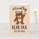 This card features a chocolate-brown bear standing upright with big, gentle dark eyes and a soft, friendly expression that feels like a quiet invitation to come closer. A small crown of blush-pink flowers with fresh green leaves rests on its head, adding a sweet, affectionate touch ❤️. On the bear’s chest sits a cream-colored heart, like a simple sign of caring that pairs nicely with the bear’s tender gaze. One paw is lifted as if mid-wave or ready for a hug, and the lighter paw pads add a cozy detail that suggests closeness between friends. The background is a calm peach tone with faint, lighter polka dots scattered around, keeping the scene soft and welcoming. Text is placed above and below the bear, with the top line in a flowing cursive style and the lower line in clear, thicker letters for emphasis. The lettering uses darker tones that stand out against the peach background, guiding your eyes from the top message down to the dedication 🌼. The bear remains centered on the page, framed by the dotted peach backdrop and the pink-and-green floral crown above its head.