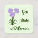 Raise self esteem with Kindness Cards! These are square business card sized cards with positive and inspirational words to hand out to friends, hide in family member's lunches, or leave for a stranger to find to brighten up their day. This design includes purple and pink flowers and the text "You Make a Difference".