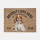 King Charles Cavalier Personalized Dog lover welcome doormat. This welcome mat can be personalized with your dog’s name, the slogan can also be changed or you could use a picture of your own dog (make sure it's transparent). Text reads: Bridget lives here…. All treats welcome
