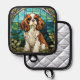 Pot holders featuring a King Charles Cavalier Spaniel artistically done in a stained glass window mode.