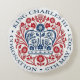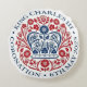 King Charles III Coronation round pillow. Be comfortable on your cushion for the big party! Coronation logo on white background.
