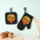 This fun oven mitt & pot holder set features text image "King of the Grill" in fire red and yellow ombre on a black background.