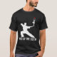 Silhouette images of a martial arts warrior in a fighting stance. Small silhouette image of a beautiful ballerina who stands on the open palm of the gentleman and dance on the tips of her toe or en pointe. Her hands are risen up in an attempt to embrace the small red heart hovering above her head. Text KING OF THE QUEEN under the images. Black background Funny one-of-a-kind t-shirt for a man. You can change or delete the text.