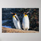 A duo of King penguins poses elegantly against a snowy landscape, their striking black, white, and orange plumage standing out vividly. A smattering of fir trees in the background introduces a hint of rustic charm to the tranquil scenery.