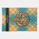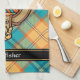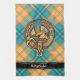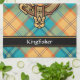 Kingfisher crest badge surrounded by a strap and buckle over tartan background. Custom text.