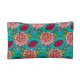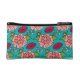A whimsical cosmetics bag featuring red lips, pink roses and white "kiss and makeup" text on a bright teal background. Keep small items within easy reach with this zippered case. A fun gift for a special lady. Original design ©Penny Cork.