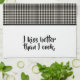 Funny kitchen towel has black and white plaid pattern with top "I kiss better than I cook." text. Great gift idea for novice cooks as well as those who are experts in the kitchen...and other departments.