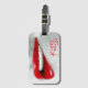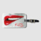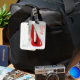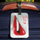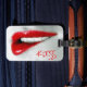 This luggage tag has lips picture on it and it says "kiss" on it.