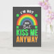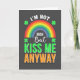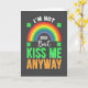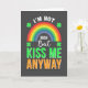 This card features the cheeky line “I’M NOT IRISH But KISS ME ANYWAY” centered on a deep charcoal background, turning the message into the main scene. A curved rainbow 🌈 arches above the first line like a bright canopy, adding bands of color that stand out against the dark backdrop. Four green clovers ☘️ sit around the lettering, like little lucky accents that frame the words and hint at a flirty St. Patrick’s Day mood. The opening phrase “I’M NOT IRISH” appears in crisp white near the top-center, keeping the setup easy to read. The word “But” sits between the lines in a flowing style, acting like a soft bridge into the more daring request below. “KISS ME” is set larger in lime green, while “ANYWAY” follows in a strong orange, with a faint shadow that gives the letters a raised look. The arrangement keeps your eye moving from the rainbow down through the white text and into the oversized green-and-orange phrase. The final detail is the subtle drop shadow behind the big words, making them stand out against the charcoal field.