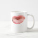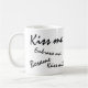 Kiss me text in English, French, German and Spanish and a drawing of kissing female lips. Funny products and gifts for anyone. Coffee mug. Customizable. You can change the image and you can change or delete four texts independently: Kiss me, Besame, Embrasse moi, Küss mich. Have fun.