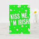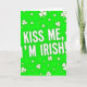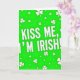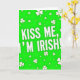 This greeting card features the big, flirty line “KISS ME, I’M IRISH!” set in oversized white capital letters right in the center, asking for a kiss with a wink of friendship and romance. Behind the message, a rich emerald green background fills the whole front like a festive backdrop for a cheerful St. Patrick’s Day moment. White shamrocks are sprinkled all around the text, some small like confetti and others larger, creating the sense of clovers drifting past as if luck is floating through the air ☘️. The bright white lettering and clovers stand out sharply against the green, making the words easy to read from across the room. The text stays centered and dominant, while the shamrocks frame it on all sides without crowding the message. The overall layout feels like a fun invitation shared between close friends or sweethearts, with the clovers acting like little accents around the teasing request 💚. Across the green field, the scattered shamrocks vary in size and spacing, with several clustered near the corners and a few drifting close to the edges of the lettering.