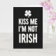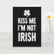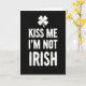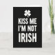 This card features a high-contrast black background with stacked white text that reads “KISS ME I’M NOT IRISH,” set in a sturdy sans-serif style that’s easy to read at a glance. A small white shamrock sits above the words, centered like a little wink that ties the message to St. Patrick’s Day ☘️. The letters have slightly softened, almost hand-drawn edges, which makes the message feel a bit more approachable, like it’s meant to spark a grin across a crowded room. The tall, vertical layout pulls your eyes from the shamrock down through each line, like a straight path leading to a daring invitation. With nothing but black and white on the front, the contrast feels direct and confident, as if the design is leaning in close. The cheeky line suggests a friendly, flirty moment—more about a quick laugh and a shared glance than any strict tradition 💚. The white shamrock and the stacked white lettering glow sharply against the deep black field, with the shamrock positioned just above the first line of text.