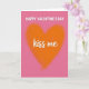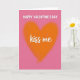 This Valentine's Day card shows a large orange heart in the middle, with soft, blurry edges that fade into a hot pink background. The heart looks like it’s gently glowing, giving the whole scene a warm, slightly dreamy feel. At the top, the words “HAPPY VALENTINE’S DAY” are written in white, all caps, in a simple sans‑serif letter style. Across the center of the heart, “kiss me” appears in thin, flowing cursive lettering, like a quick handwritten note. The contrast between the straightforward greeting up top and the sweet request across the heart makes the message feel both fun and sincere 🥰. With just a heart, bright colors, and a few words, it says what you might be shy to say out loud, whether it’s for a partner or someone you’re getting close to ❤️.
