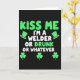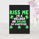 This card features a high-contrast St. Patrick’s Day design on a deep black background, built around the cheeky line “KISS ME I’M A WELDER OR DRUNK OR WHATEVER.” “KISS ME” and “DRUNK” stand out in bright green, while the rest of the wording is in white, stacked in centered lines for easy reading. Two emerald leprechaun hats angle inward from the upper left and upper right, like they’re leaning in on the joke the way close friends might at a crowded party. Each hat has a small gold buckle that catches the eye and adds a little shine against the dark backdrop. The green-and-white lettering keeps the focus on the message while still nodding to classic holiday colors 💚. Along the bottom edge, three glowing green shamrocks sit spaced evenly like a simple border, with their rounded shapes echoing the smooth look of the type. The hats remain slightly tilted above the centered text, and the trio of shamrocks forms a neat row near the lower margin ☘️.