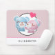 Personalized mousepad with a cute cartoon image of a bear couple, the she bear is pastel pink with a little bow and she is kissing the cheek of a blue bear who looks positively delighted. A little pink heart is floating above their heads. Very cute and kawaii. Background pattern is a muted pink color with white polka dots.