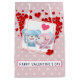 Valentine's day gift bag with a cute cartoon image of a bear pair, one bear is pastel pink with a little bow and she is kissing the cheek of a blue bear who looks positively delighted. Very cute and kawaii. Lots of red hearts floating all around. Muted Pink background with a white polka dot pattern. The back says: You are loved. All text is editable / removable.