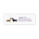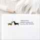 White return address label, with adorable graphics of brown and black silhouettes of dachshunds kissing. Text in purple is ready to personalize with your name and address. Cute finishing touch to our whimsical dachshund wedding and bridal shower sets.