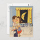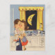 Cute retro artwork showing a husband and wife kissing while doing dishes. The smiling crescent moon in seen in the window.