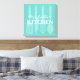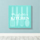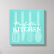 Kitchen cooking utensils wall art wrapped canvas. Cute home decor with elegant typography and spoon knife spatula whisk / whipper. Aqua / Turquoise blue or custom color background. Personalized baking and cook decorations for home, office, food court or gourmet restaurant. Customizable accessories for trendy modern interior.