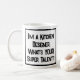 Funny slogan on a mug that says "I'm a Kitchen Designer. what's YOUR super talent?". Mug for a Kitchen Designer. Black and white bold text.