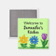 Pretty garden flowers in golden yellow sunflower, blue yellow daisy, purple tulip in bloom in the green grass. Welcome to Name is written in black script against a refreshing pretty green background. Personalize with your Name. Lovely magnet to enjoy the warmth of the spring or summer months anytime of year. See my Kitchen/Dining Room folder for Mix & Match items, etc. Original Graphic Artwork © TamiraZDesigns.