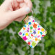 The key chain is made of metal and really sturdy. The flower design is really cheerful. The logo and colors are clear and crisp!