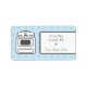 A kitchen label featuring a background of blue with light green polka dots. Illustration of retro white stove at right. White frame with gray scalloped edges at right. Customizable text. Look for matching items at Jill's Paperie.