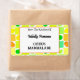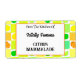 An editable baking or canning sticker with a colorful citrus fruit pattern of lemons, limes, oranges and citrus slices on squares of white, orange, teal and yellow, for marmalade, jellies or other recipes, with retro script and block letters.