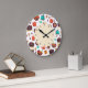 Very cute retro style home cooking pots and pans, pitcher, coffee pot, fruit bowl and utensils on a kitchen clock with dull pink scalloped lace with hour notches in brown.