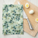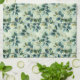 This kitchen towel is shown in a lovely blue and green tones botanical print design.