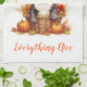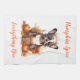 This kitchen towel is shown with a cute French bulldog art print for autumn, text reads Pumpkin Spice Everything Nice.