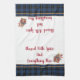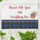 This kitchen towel is shown in sapphire blue and tan plaid with tan accent stripes. Words of "Blessed with spice and everything nice" shown in red. Shown on a white towel, with Christmas gingerbread house accents.