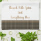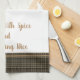 This kitchen towel is shown in dark driftwood and smoke plaid with tan accent stripes. Words of "Blessed with spice and everything nice". Shown on a white towel.