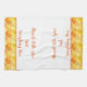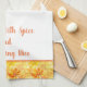 This kitchen towel is shown in fall color mix of orange and yellows with orange accent stripes. Words of "Blessed with spice and everything nice". Shown on a white towel.