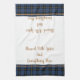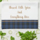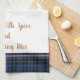 This kitchen towel is shown in sapphire blue plaid with tan accent stripes. Words of "Blessed with spice and everything nice". Shown on a white towel.