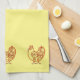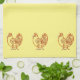Chicken created from copper wire and beads. Three images on each end of the cloth. Background is pale yellow. Original wire art by Nora Chen.