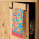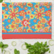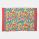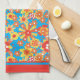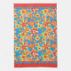 A Kitchen Towel or Tea Towel, with a cheerful all-over pattern of red, orange and yellow flowers on a bright turquoise background, from a handpainted paper collage by Judy Adamson.