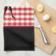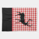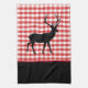 This kitchen towel is shown in a cute red plaid print design with a deer print.