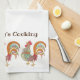 Kitchen towel shown in a ivory shade and fanciful rooster chickens art print design. Text on towel reads "Something's Cooking". Multi Color.