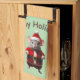 Santa Mouse with Holiday greetings. AI generated image of mouse in red and white Santa suit. Text is red with dark green outline and states "Happy Holidays!" Background is light green.